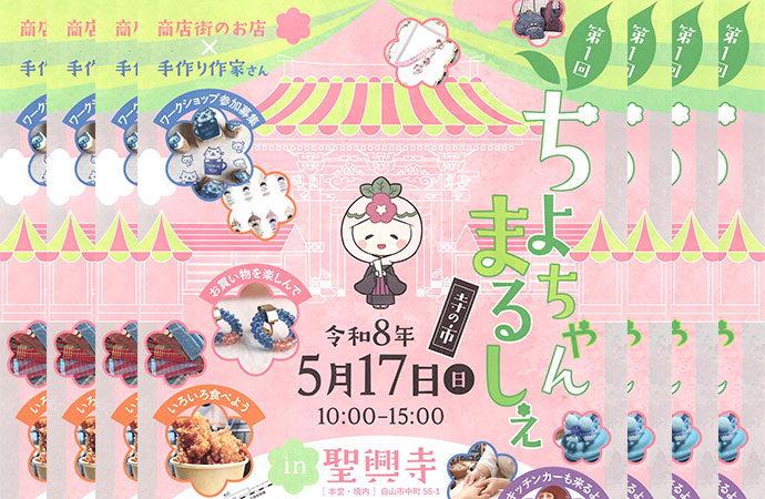 第1回 ちよちゃんまるしぇ 商店街のお店 × 手作り作家さん 開催日時:令和8年 5月17日(日) 時間:10:00 ~ 15:00 備考:雨天決行・入場無料 会場:聖興寺[本堂・境内] 住所:白山市中町 56-1 イベ もっと読む →
